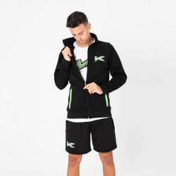 La sudadera tiene cremallera completa, bolsillos laterales con cremallera y puños elásticos. Los pantalones son de corte slim con bolsillos delanteros con cremallera, cintura ajustable con cordón exterior y puño en el bajo con cremallera. Logo K bordado e interior forrado en ambas piezas para los días más fríos.